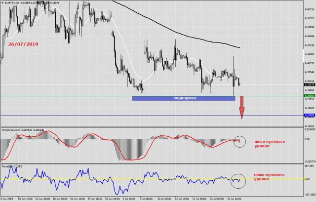 Цена находится под средней скользящей МА 20 и МА 200, что указывает на нисходящий тренд. MACD под нулевой линией. Осциллятор Force Index под нулевой линией. При пробое ценового уровня вниз, следующие рекомендации: • Временной период: H4 • Рекомендация: Продажа • Уровень входа в позицию: Продажа при пробитии 6.2900 • Уровень Take Profit: 6.2200 (700 пунктов) При отбое от уровня поддержки следующие рекомендации: • Временной период: H4 • Рекомендация: Покупка • Уровень входа в позицию: Покупка по 6.3900 • Уровень Take...