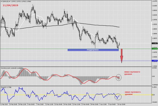 Анализ по EURAUD на 11.04.2019 Цена находится под средней скользящей МА 20 и МА 200, что указывает на нисходящий тренд. MACD под нулевой линией. Осциллятор Force Index под нулевой линией. При пробое ценового уровня вниз, следующие рекомендации: • Временной период: H4 • Рекомендация: Продажа • Уровень входа в позицию: Продажа при пробитии 1.5710 • Уровень Take Profit: 1.5600 (110 пунктов) При отбое от уровня поддержки следующие рекомендации: • Временной период: H4 • Рекомендация: Покупка • Уровень входа в позицию:...